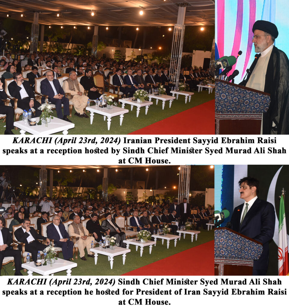 Sindh Chief Minister Syed Murad Ali Shah remarked on the longstanding ties between Pakistan and Iran, highlighting the significance of commencing the journey of regional development from the land of Sindh. He expressed these sentiments during a grand and dignified ceremony held at the Chief Minister House to welcome the esteemed Iranian President, HE Seyyed Ebrahim Raisi. Shah emphasized the honor he felt in welcoming President Raisi, a longstanding friend and benefactor of Pakistan. Acknowledging the historical relations between the two nations, Shah extended warm regards from the people of Sindh to President Raisi and his accompanying delegation. He emphasized the deep-rooted religious, academic, cultural, and economic bonds between Pakistan and Iran, which have strengthened over time. Shah underscored the pivotal roles played by leaders such as Shaheed Zulfikar Ali Bhutto and Shaheed Mohtarma Benazir Bhutto in nurturing the ties between Pakistan and Iran. He also lauded President Asif Ali Zardari’s consistent support for Iran and emphasized the importance of Pakistan Peoples Party’s efforts in highlighting the significance of Pakistan-Iran friendship. Furthermore, Syed Murad Ali Shah stressed the necessity for regional progress through collaboration among all nations, emphasizing the crucial need for cooperation in addressing issues like terrorism, illegal trade, climate change, and the escalating injustices in Palestine and Kashmir. He urged unity among Muslims to support their Palestinian brethren in their time of need. Regarding the Kashmir and Palestine issues, Shah reaffirmed Pakistan’s firm stance on advocating for immediate ceasefire in Gaza and resolving the plight of oppressed Kashmiris in accordance with United Nations resolutions. Expressing gratitude for Iran’s unwavering support, Shah emphasized the importance of enhancing relations between the two countries. He assured President Raisi of Sindh’s commitment to strengthening educational, cultural, social, and economic ties with Iran, as well as creating a conducive environment for trade and investment. Murad Shah concluded by inviting Iranian brothers and sisters to explore investment opportunities in Sindh, emphasizing the region’s safe and attractive investment climate. He expressed hope that the journey of regional progress would commence from the soil of Sindh. In a heartfelt message conveyed in Persian, Shah assured President Raisi that the hearts and minds of the Pakistani people would always remain open to him. The ceremony at the Chief Minister House was attended by over 900 distinguished guests, including provincial ministers, chief secretary, IG police, provincial secretaries, educationists, experts from various fields, prominent industrialists, and members of civil society. President Raisi delivered a historic address at the event, marking a significant moment in the Pakistan-Iran relationship.