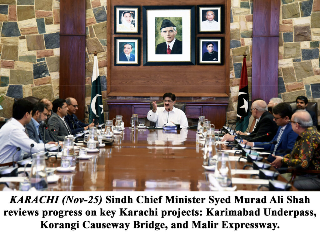 KARACHI (Nov 25): Sindh Chief Minister Syed Murad Ali Shah presiding over a review meeting of three important projects of the city – Karimabad Underpass, Korangi Causeway Bridge and Malir Expressway directed the local government department to submit him a date completion plan.