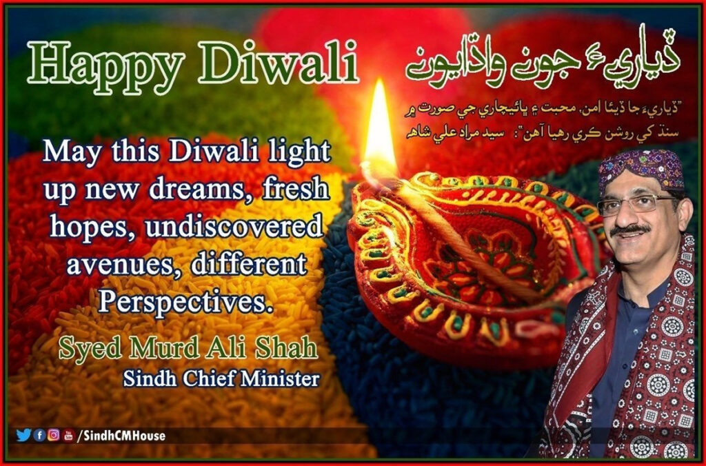 Sindh Chief Minister Syed Murad Ali Shah congratulated the Hindu community, saying that “Diwali is a celebration of light, happiness, and peace.”