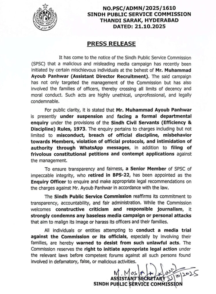 In an official press release, the SPSC stated that the campaign was initiated “by certain mischievous individuals at the behest of Mr. Muhammad Ayoub Panhwar, Assistant Director Recruitment,” who is currently under suspension and facing a formal departmental inquiry under the Sindh Civil Servants (Efficiency & Discipline) Rules, 1973.