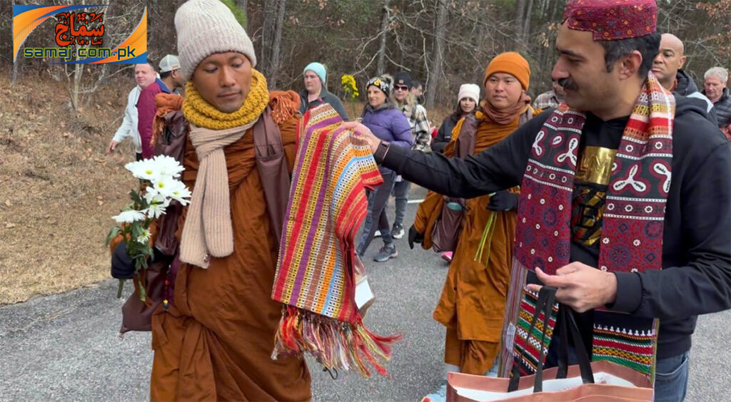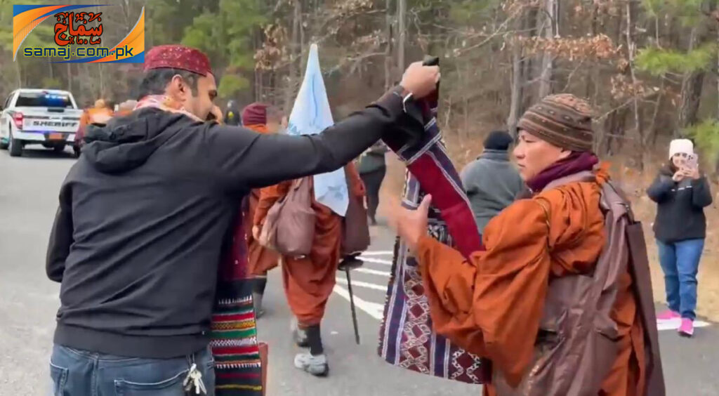 The march will conclude in Washington, D.C. in February 2026. Speaking on the occasion, JSQM leader Habib Bhutto said that Buddhists are peace-loving people. He said that after walking for 90 days to reach North Carolina, he considered it his duty to participate in the march and welcome them with Sindh’s traditional Ajrak.